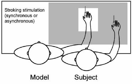 In an early experiment called the "rubber hand illusion," subjects were seated with their right arm resting on a small table. A standing screen was positioned beside the arm to hide it from the subject's view and a life-sized rubber model of a right hand and arm was placed on the table directly in front of the subject. The subject sat with eyes fixed on the artificial hand while researchers used two small paintbrushes to stroke the rubber hand and the subject's hidden hand, synchronizing the timing of the brushing as closely as possible. As a researcher stroked the real hand and the rubber hand simultaneously with a stick, subjects had the vivid sense that the rubber hand was their own. When the rubber hand was whacked with a hammer, they winced and sometimes cried out.