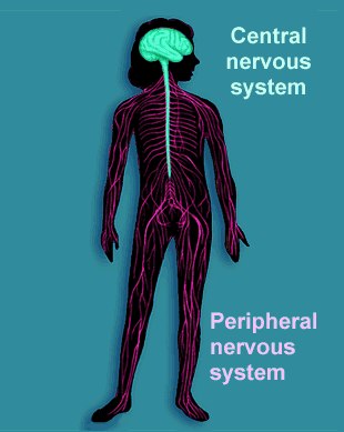 The brain is part of the overall human nervous system, composed of the central nervous system and the peripheral nervous system. The central nervous system is comprised of the brain and the spinal cord. The peripheral nervous system includes the sensory neurons that link the brain and spinal cord to sensory receptors and efferent neurons connected to the muscles, glands, and organs.