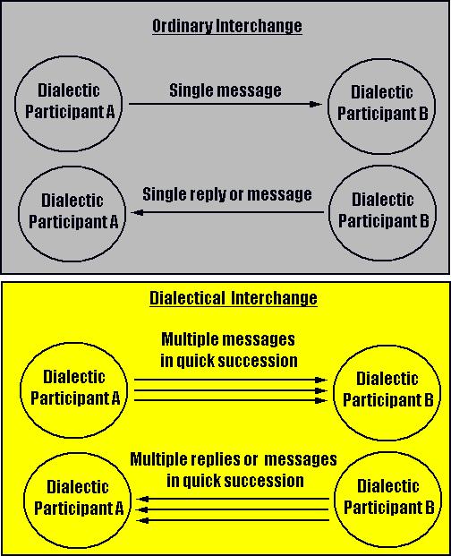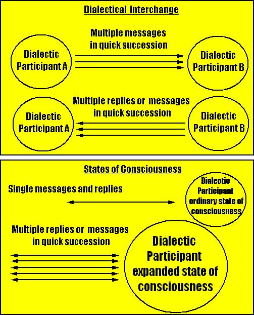People become so habituated to rapid-fire, thoughtless interchange that when they experience advanced persons in accustomed conversation or in an interview context, the slower pace is disturbing to them. Ordinary persons engage in "performing" most of the time in whatever context of communication they engage in: speaking as rapidly and mindlessly as possible, always "being on camera or on microphone," unable to enter into the higher state of consciousness involved in dialectical interchange.You'll note in the above diagram that when two advanced persons are engaged in genuine dialectical interchange (either in verbal face-to-face interchange or online), that they communicate at the fastest possible pace: 1. A. We'll examine this phenomenon in the discussion of online chat dialectical interchange below.