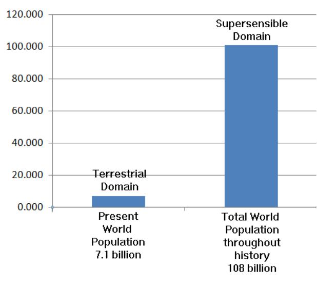 Our experience of mortal life in the terrestrial domain appears to be essential to our eternal development. During earthly existence we are given the opportunity to gain awareness of our Higher Self--that is, our eternal being in the supersensible domain. The Higher World of eternal being contains all humans who have previously existed on the terrestrial plane--estimated to be 108 billion. The world population at the present time is 7.1 billion.