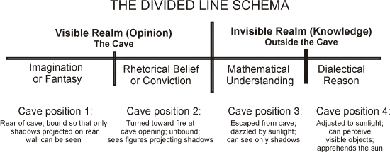 Plato explained True Reality and False Reality through his Allegory of the Cave and through his divided line schema (see below). The visible realm is the realm of False Reality (falsehood, evil, mere opinion, false imagination, lies, fantasy, delusion) and the Invisible Intelligible Realm of Knowledge is the realm of True Reality (Goodness, Love, Beauty, Truth, Justice, Understanding). False Reality is life within the cave--either in chains or out--and True Reality is life outside the cave and the life of the philosopher when he returns to the cave to help the prisoners.